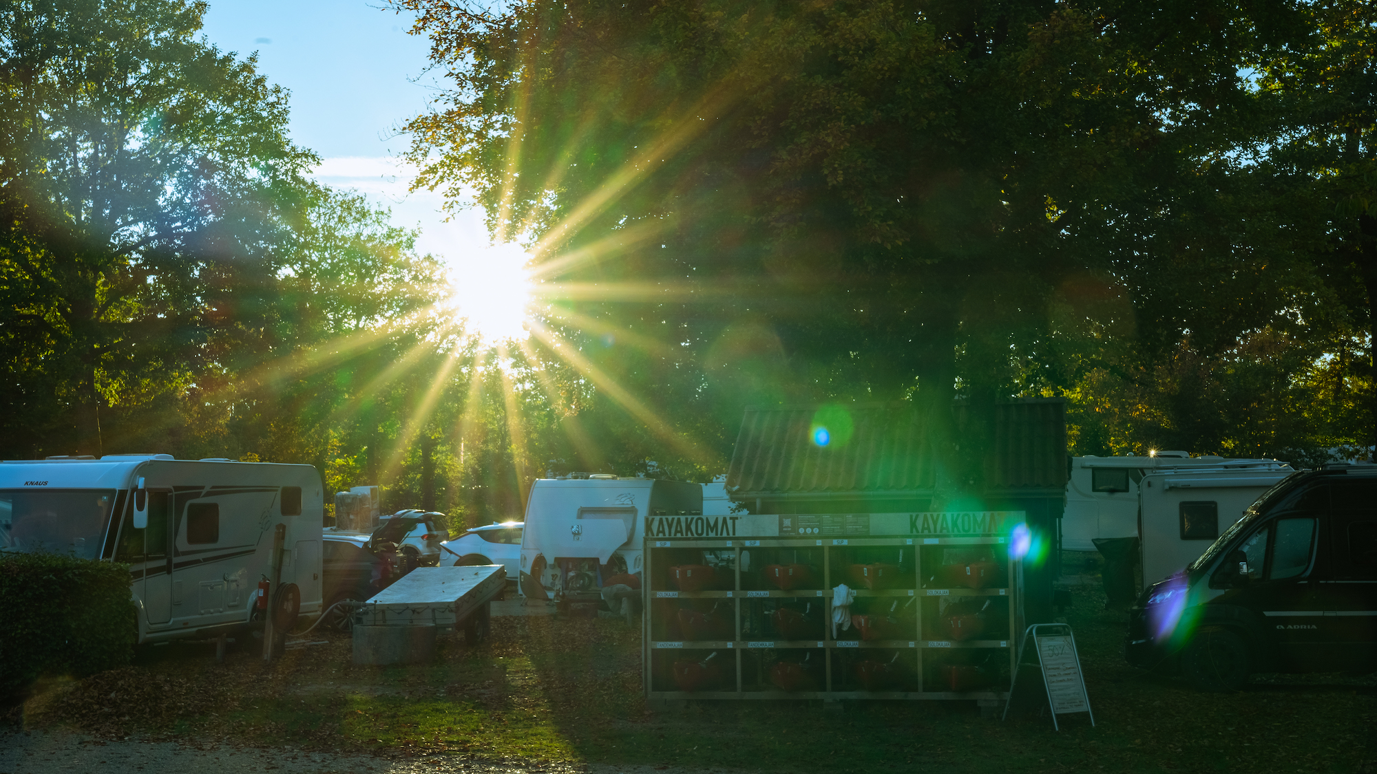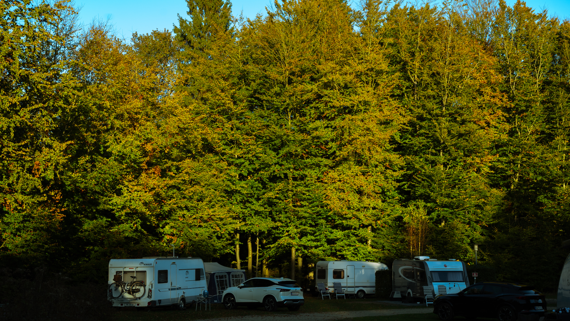 - Campen er omkranset af skov, og mange pladser ligger mellem høje træer, som giver både læ, skygge og en særlig stemning.