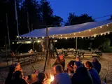 Der er både inde- og udekøkken på campen. Der er også fællesgrill. Vi arbejder på at integrere industriovn og stort køle- og fryseskab, så det bliver lettere for grupper at tilberede et fælles måltid. Langbordsmiddage er noget af det bedste, vi ved.