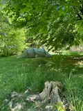 En lille, skjult sti fører ind til campens naturperle: Teltpladsen. Her er der ikke mulighed for strømtilslutning, til gengæld er der højt til loftet og fuglefløjt i lydkulissen.